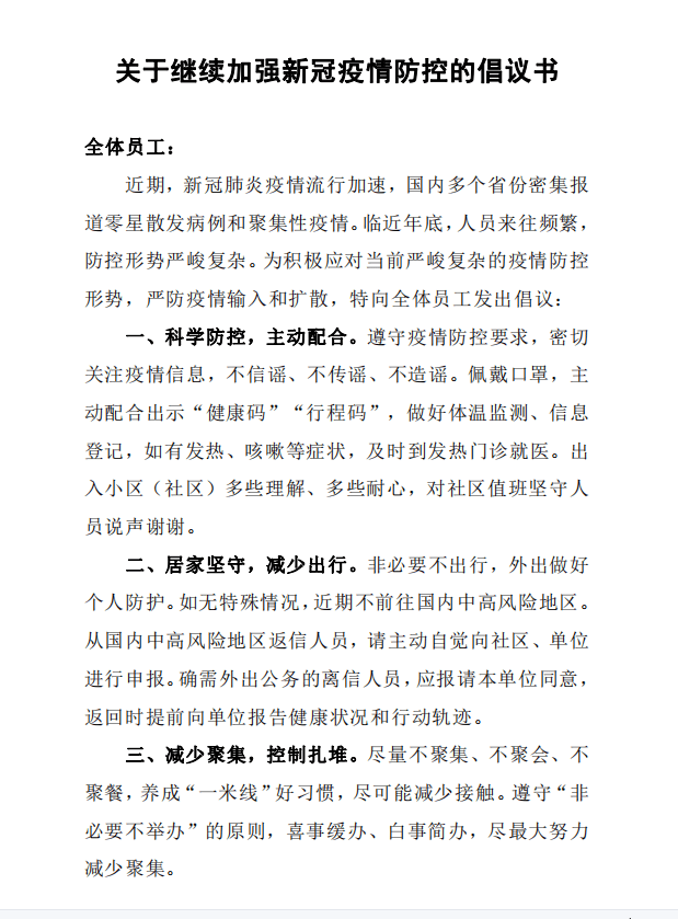 關(guān)于繼續(xù)加強(qiáng)新冠疫情防控工作的倡議書(shū)