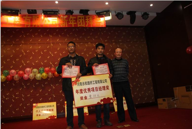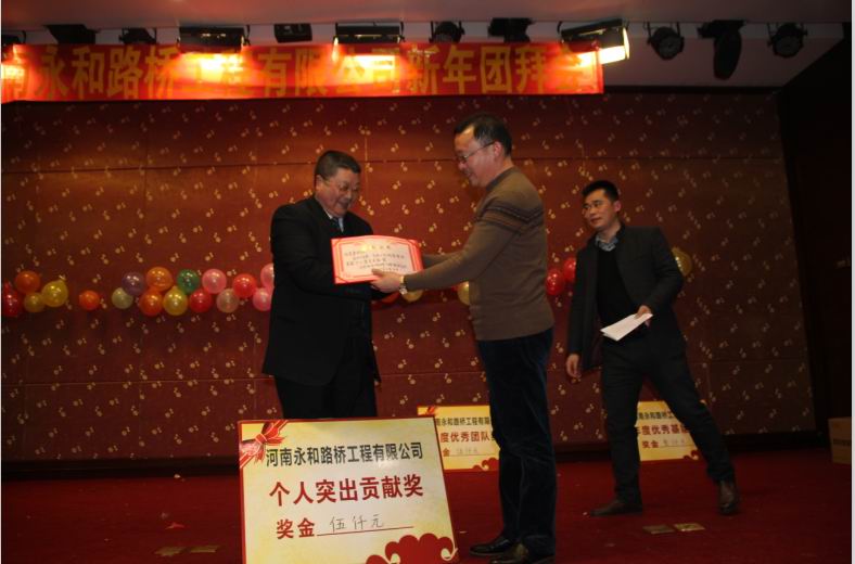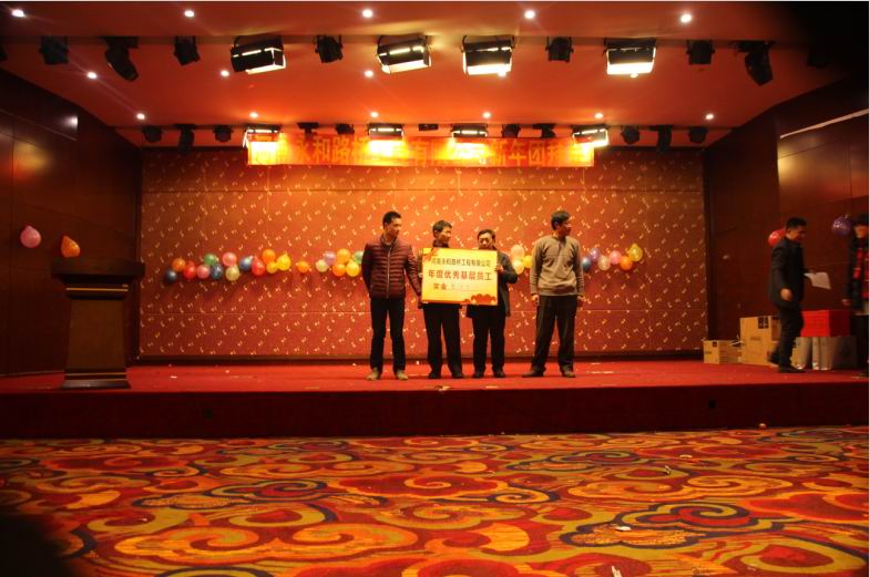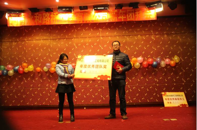 2016年2月4日晚,農(nóng)歷臘月26日晚,河南永和路橋工程有限公司在信陽市五星 級酒店中樂百花酒店隆重的舉行了2016年新春團(tuán)拜會,本次團(tuán)拜會由公司全體員工及家屬、公司的合作伙伴、朋友等共同出席,大家歡聚一堂、把酒言歡、其樂融融。公司董事長孔總發(fā)表新年賀詞比代表公司對年度優(yōu) 秀個人及團(tuán)隊進(jìn)行了表彰。公司還為到場的每位小寶寶送上新年祝福和紅包,并準(zhǔn)備了抽獎環(huán)節(jié)。大家歡歌笑語,一直將熱鬧、愉快的氛圍維持到午夜。圖為團(tuán)拜會期間頒獎儀式